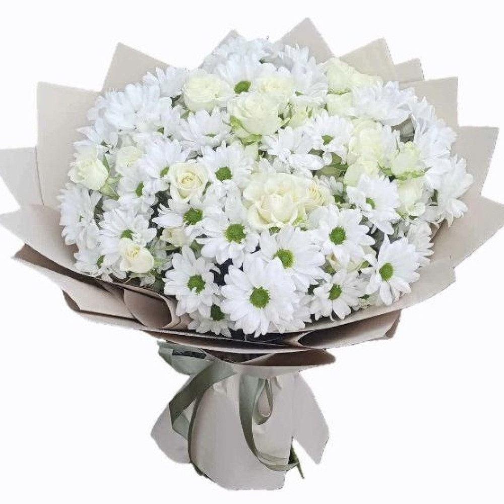 Composition: 8 branches of white spray chrysanthemums, 5 branches of white spray roses, packaging