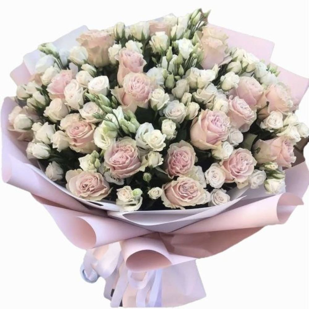Composition: 19 roses, 5 branches of white eustoma, 5 branches of spray roses, packaging