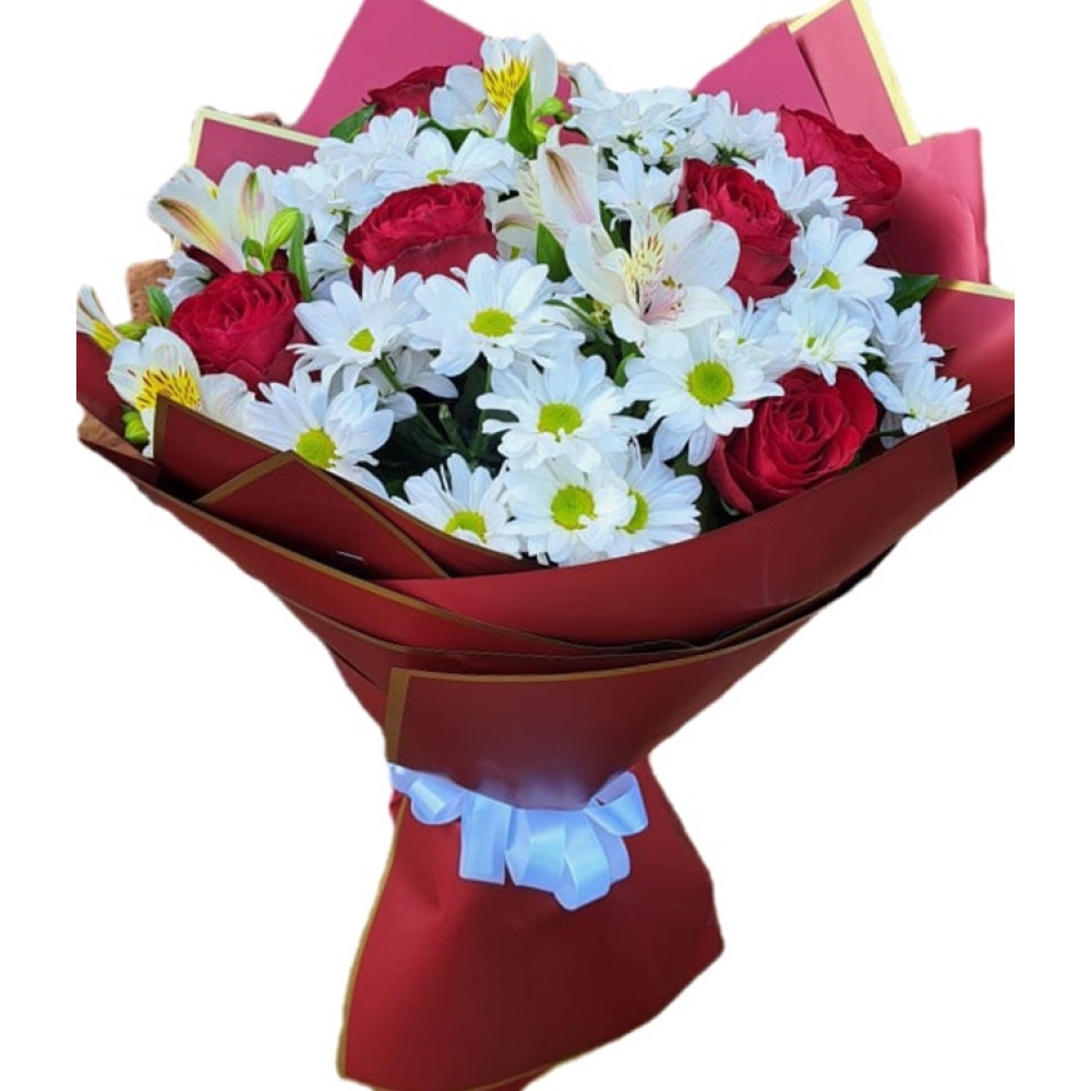 Composition: 7 red roses, 3 branches of chrysanthemum, 3 branches of alstroemeria, paper packaging