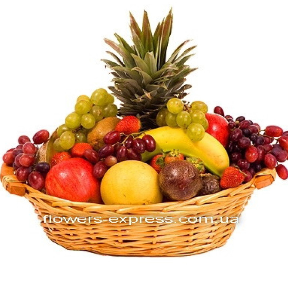 Ingredients: basket, pineapple, bananas, grapes, apples, oranges, strawberries (in season), pomegranate