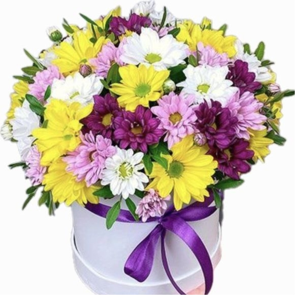 Composition in a box of 9 branches of multi-colored chrysanthemums