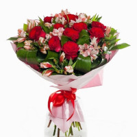 Состав: 19 желтых роз, 10 альстромерий и 10 фиолетовых ирисов, упаковка