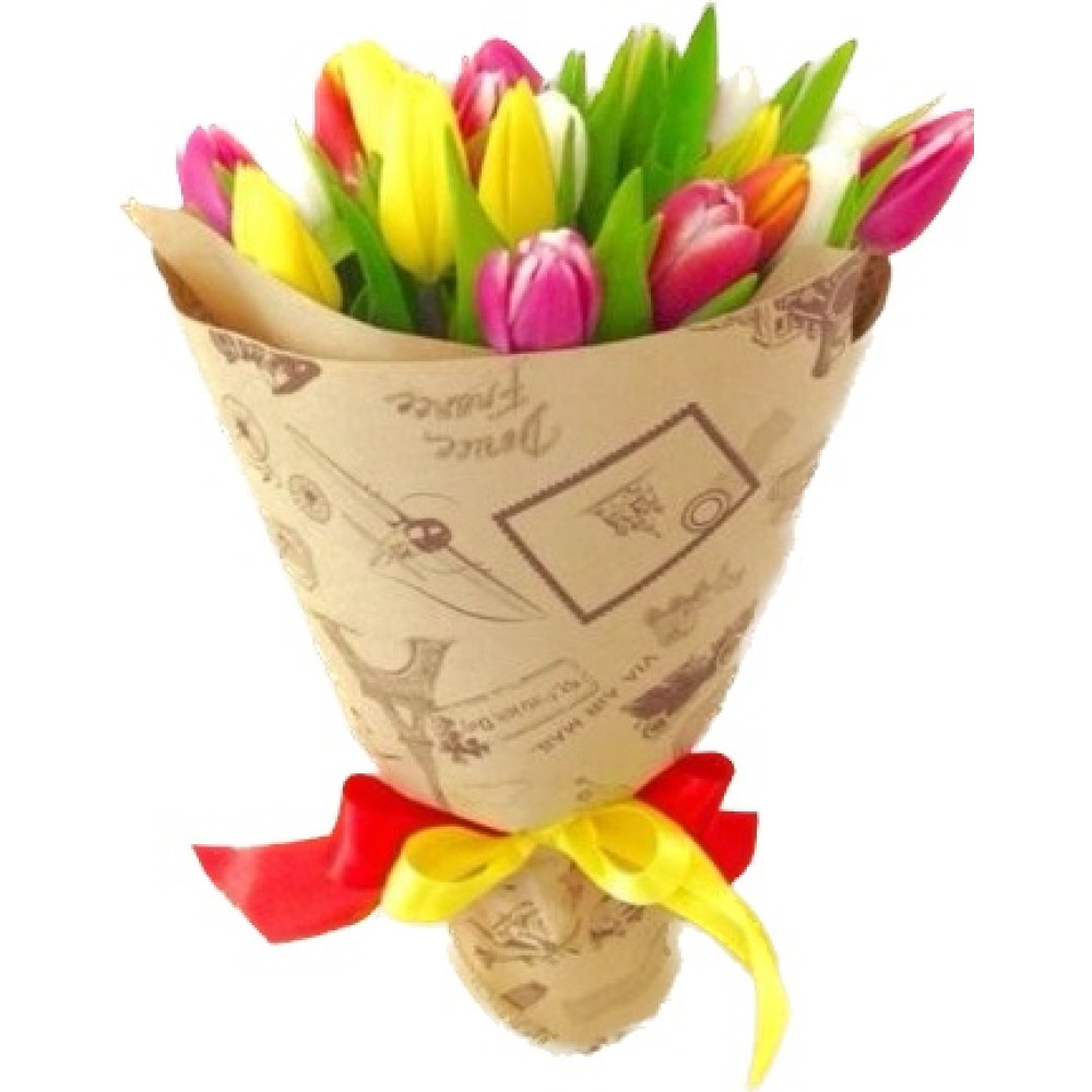 Букет з 21 різнокольорових тюльпанів у паперовій упаковці.