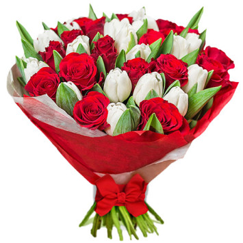 Склад: 15 червоних троянд, 14 білих тюльпанів, упаковка