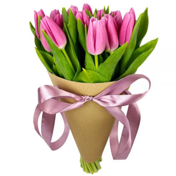 Букет із 11 рожевих тюльпанів у паперовій упаковці.