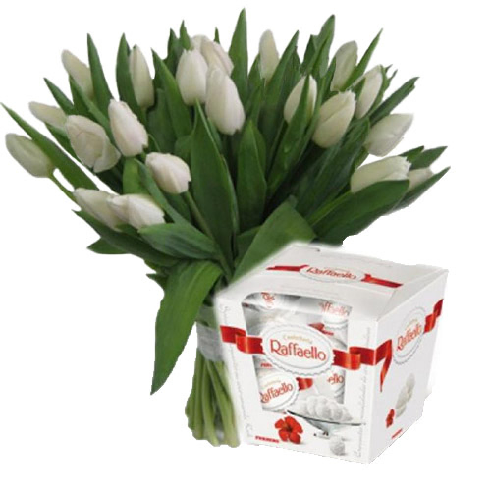 Букет з 19 білих тюльпанів з коробкою цукерок Раффаело