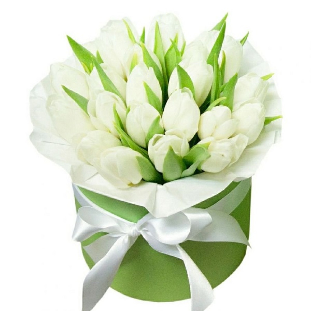 Композиція з 25 білих тюльпанів у коробці з оазисом.