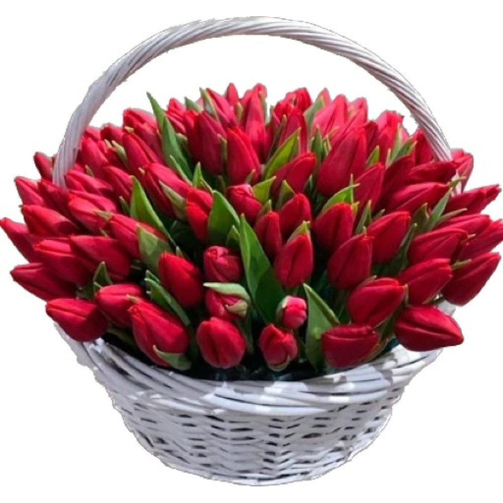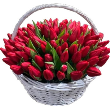Велика композиція зі 101 червоного тюльпану в кошику.