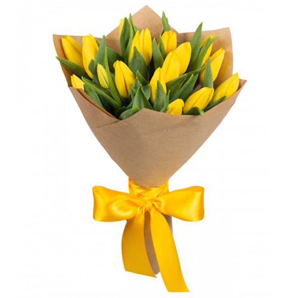 Букет із 15 жовтих тюльпанів у паперовій упаковці.